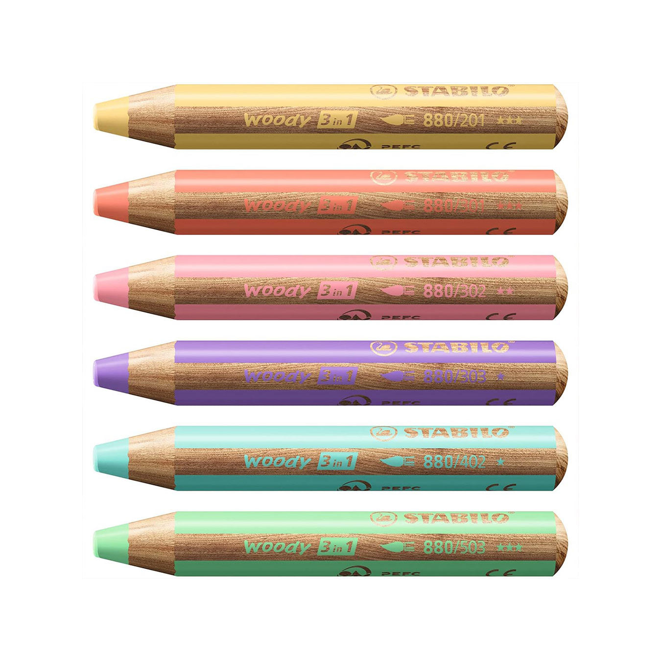 A real all-rounder With the STABILO woody 3 in 1 duo colouring pencil, colourful painting designs can be achieved thanks to the robust duo lead. With the ten unique colour combinations it leaves no limits to creativity and imagination and allows colourful drawing fun! STABILO woody 3 in 1 duo is a colouring pencil, watercolour and wax crayon all in one. It can be used to draw and colour on windows, lunch boxes, mirrors, blackboards and, of course, paper and cardboard! This makes the multi-talented colouring pencil particularly popular with children, but parents can remain relaxed as it can be easily washed off smooth surfaces like glass. The lead has eight times as much colour as a normal colouring pencil, which makes for extra-long colouring fun. The STABILO woody 3 in 1 duo chunky shape fits perfectly in children's hands, and withstands even the wildest colouring adventures with its 10 mm lead.