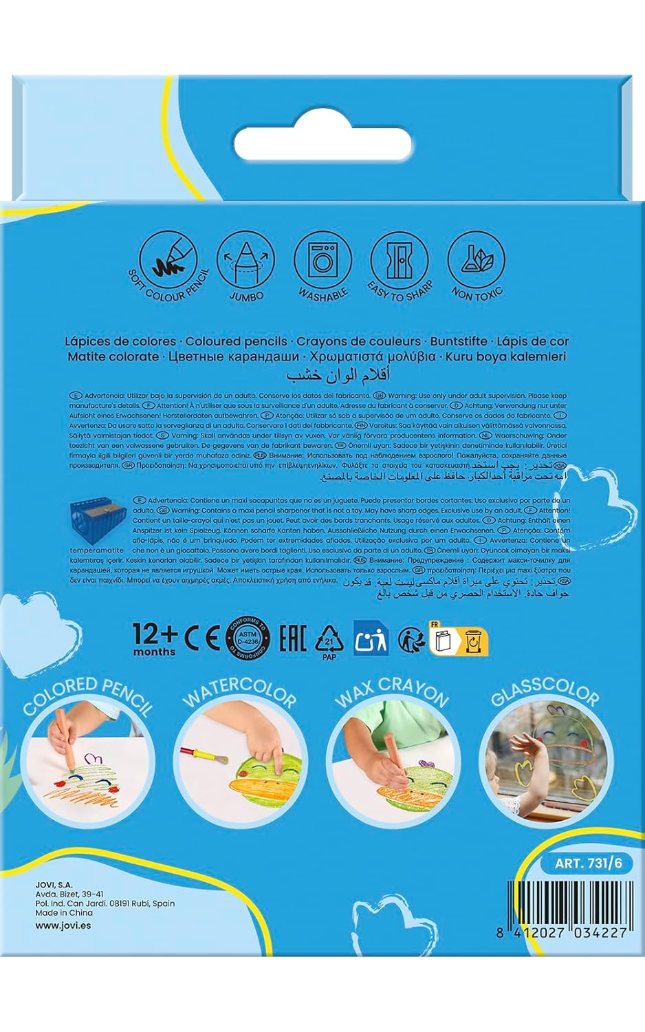 Jovi My First 6 Extra Thick Coloured Pencils for Children (12+ Months) with Sharpener – 4-in-1 Assorted Colours