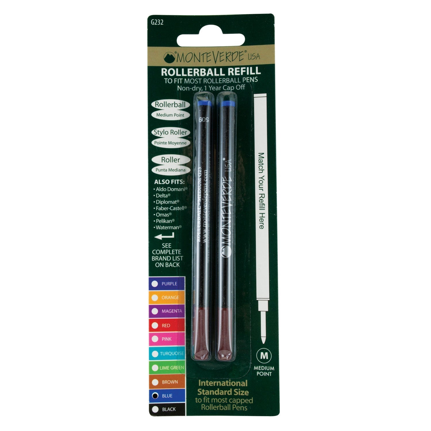 Monteverde Roller Ball Pen Refill - Medium - Blue - Pack of 2